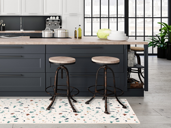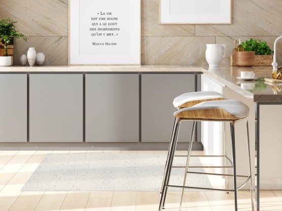 Ce tapis convient à toutes les pièces de la maison. il peut être facilement nettoyé à l'éponge. Son design imite le terrazzo, un assemblage de petits morceaux de marbre colorés liés par du ciment, utilisé en architecture et en décoration depuis l'Antiquité.