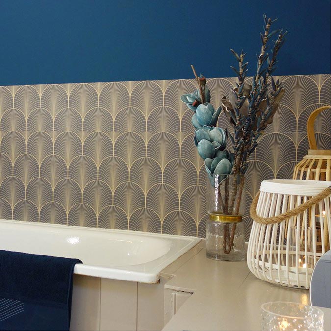 La tendance Art Déco ne cesse de se renouveler et entre dans toutes les pièces de la maison. Ici, dans la salle de bain avec un choix audacieux de mix couleurs : la crédence Klimt gris (qui existe aussi en bleu nuit) a été associée avec une peinture et des accessoires bleu foncé. Un résultat chic et chaleureux…