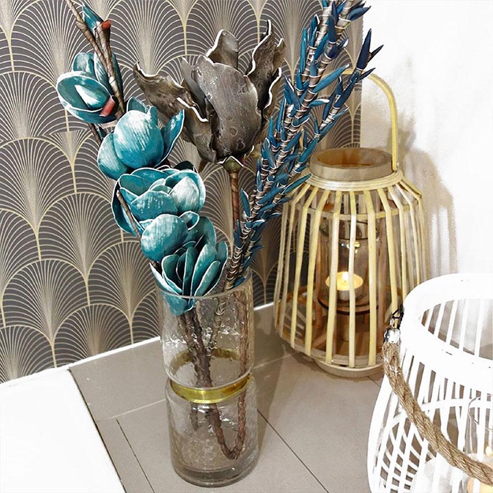 Les motifs Art Déco et les tons de beige et de bois brut s’harmonisent à merveille. Ici les papiers peints et crédences Lotus et Majestic ont été associés à des couleurs ou matières naturelles (bois, plumes, métal, céramique, or) pour une atmosphère douce et élégante à la fois.